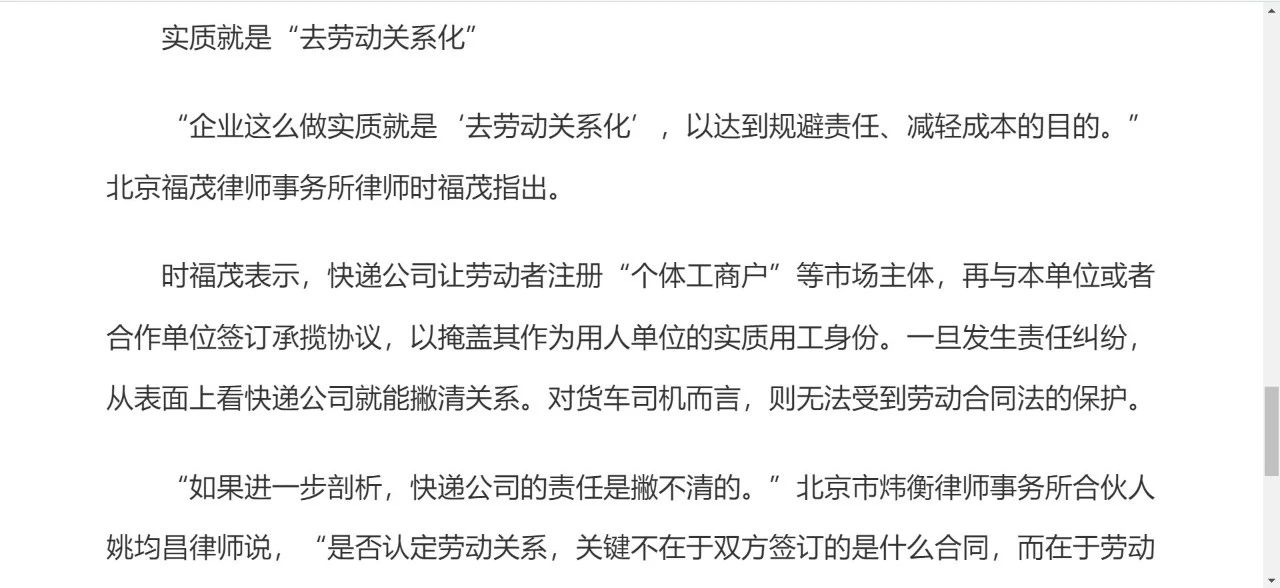 快递公司的货车司机,在不知情的情况下被注册成个体工商户,一旦出事故由谁来担责?《工人日报》记者卢越就企业规避责任和减轻成本的做法采访了本所主任时福茂律师。
