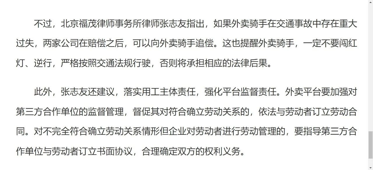 由于骑手赶时间送外卖而引发的交通事故屡见不鲜,而这类案件中谁来承担伤者的赔偿责任也成为热点话题。《工人日报》记者 杨召奎就交通事故中配送服务公司的责任及平台企业劳动关系问题采访了本所合伙人张志友律师。