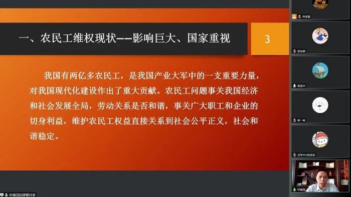 时福茂律师首先介绍了我国农民工的维权现状。我国的农民工总数庞大,农民工问题事关我国经济和发展全局,维护农民工权益直接关系到社会公平正义和社会稳定。时律师结合职业经历讲述了处于弱势地位的农民工维权难的问题。时律师以他在农民工法律援助工作站的工作为例为我们进行了详细阐述。他提出,捍卫农民工权益要不畏强势。农民工处于弱势地位,作为农民工公益律师要具有一往无前的勇气和定力,充分相信人民群众,要满怀正义感地捍卫农民工群体的合法权益。