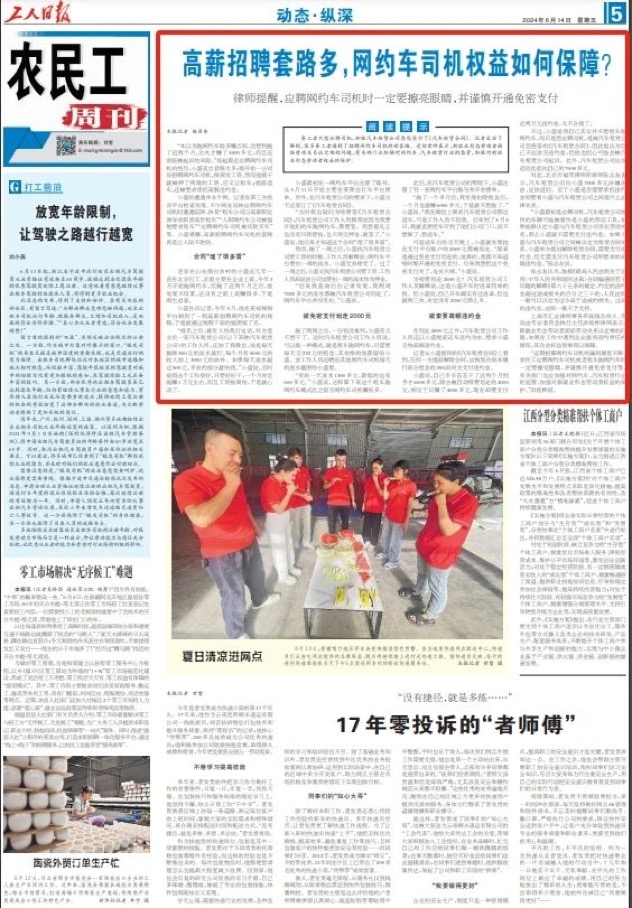 6月14日《工人日报》第五版报道了劳动者应聘网约车司机遭遇“被索要高额违约金”等困扰,我所合伙人张志友律师接受采访表示汽车租赁公司索要的高额违约金可能涉嫌违法,应该退回。